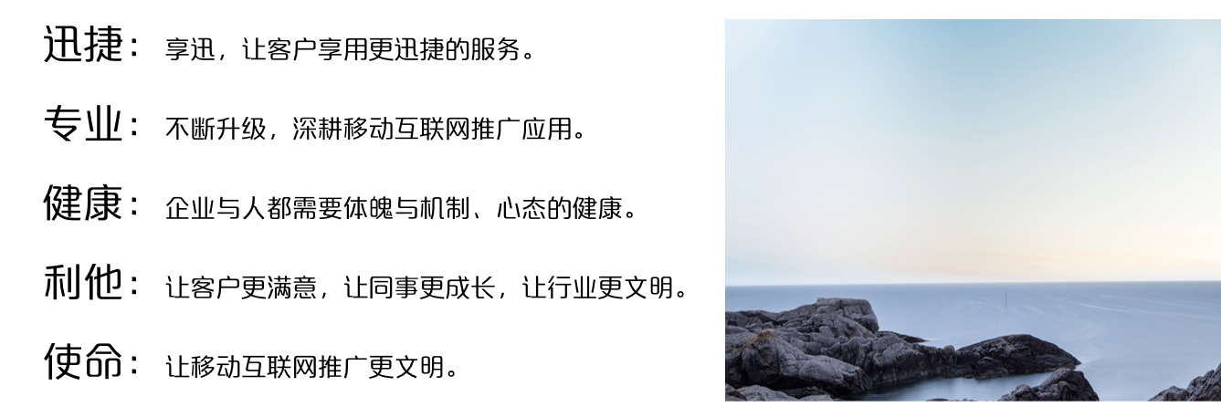 享迅科技始终以“迅捷、专业、健康、利他”的价值观为宗旨,立足于中国,放眼全球,不断创新科技能力,为移动互联网推广更文明而努力,帮助政企享受迅捷的移动互联网推广应用服务!